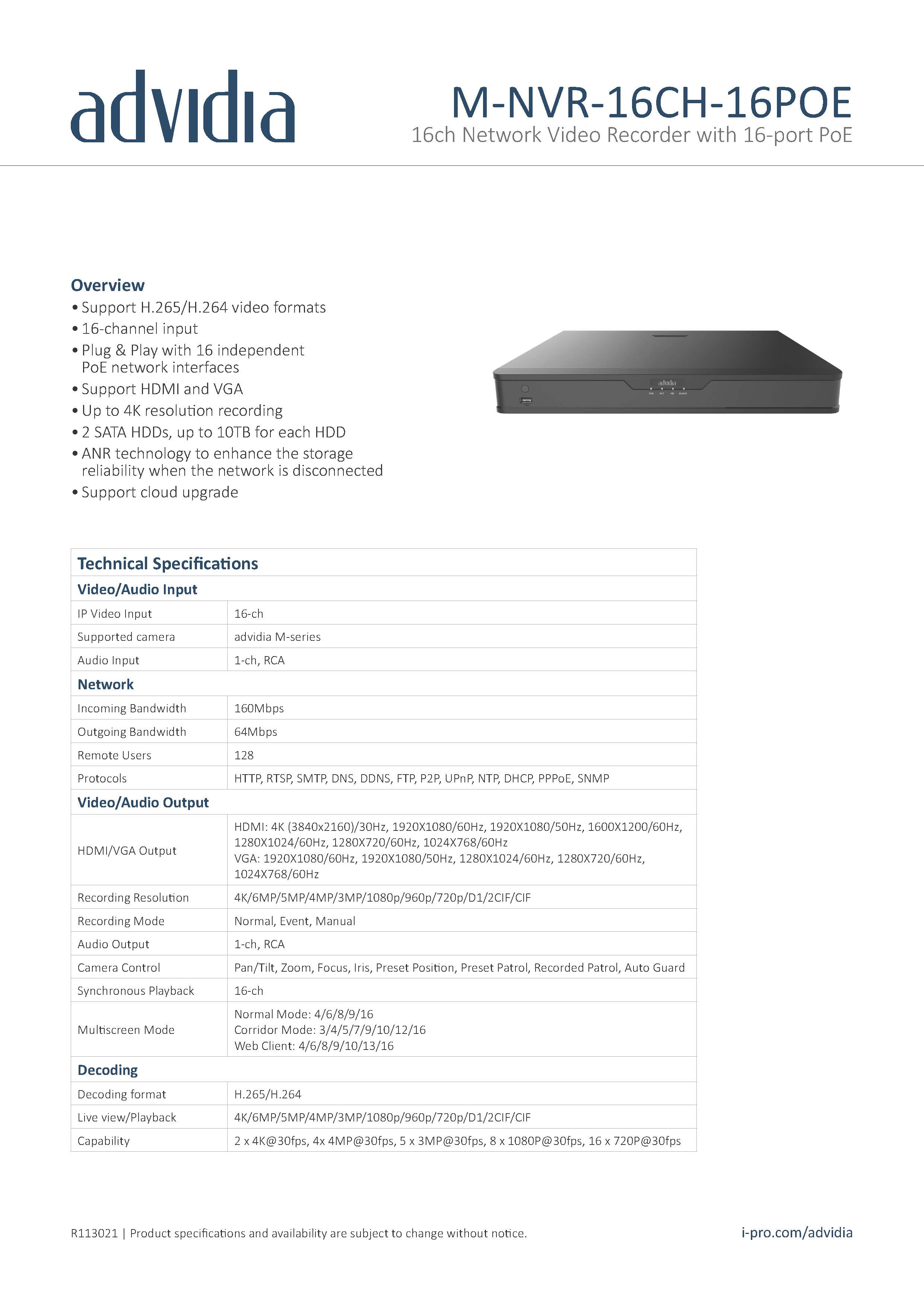เครื่องบันทึก NVR รองรับการบันทึกภาพจากกล้องความละเอียดสูง เช่น 4MP, 5MP หรือ 8MP รองรับการบีบอัดแบบ H.264 / H.265 / H.265+ การเชื่อมต่อรองรับ HDD สูงสุด ~10TB) รองรับกล้อง IP ได้สูงสุด 16 ช่อง (16CH)
