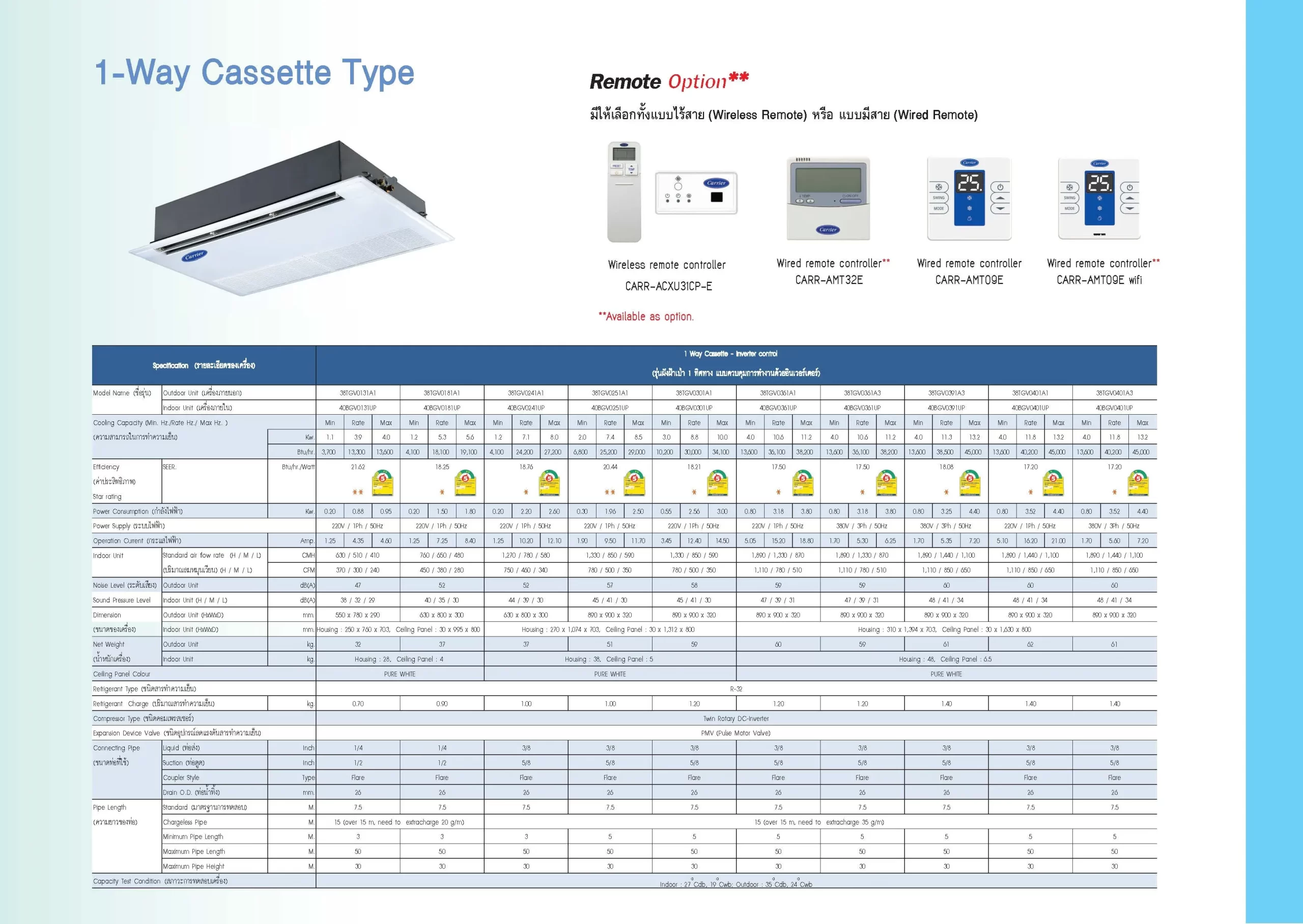 เครื่องปรับอากาศ Carrier แบบแยกส่วน ตั้ง/แขวน รุ่น 42VLY Series พร้อมคอนเดนซิ่งยูนิตระบายความร้อนด้วยน้ำ รุ่น 07TEY Series ใช้น้ำยา R-32 มาพร้อมรีโมทไร้สาย