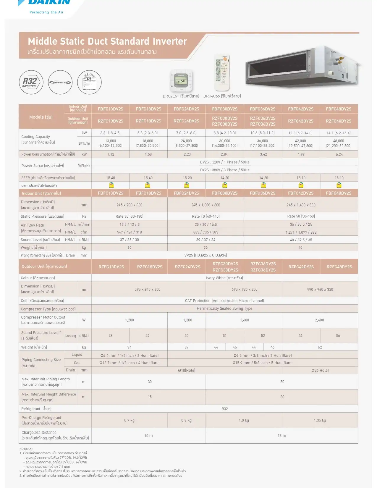 เครื่องปรับอากาศชนิดฝังผ้าต่อท่อลม Duct Inverter แบบ Low Static ประหยัดไฟเบอร์5 ขนาดหน้ากว้างเพียง 70 70 เซนติเมตร เหมาะสำหรับโรงแรมและห้องนอน เสียงเงียบเพียง 25 เดซิเบล ท่อน้ำยาและท่อน้ำทิ้งออกสองทางซ้ายขวา ถอดล้างง่าย