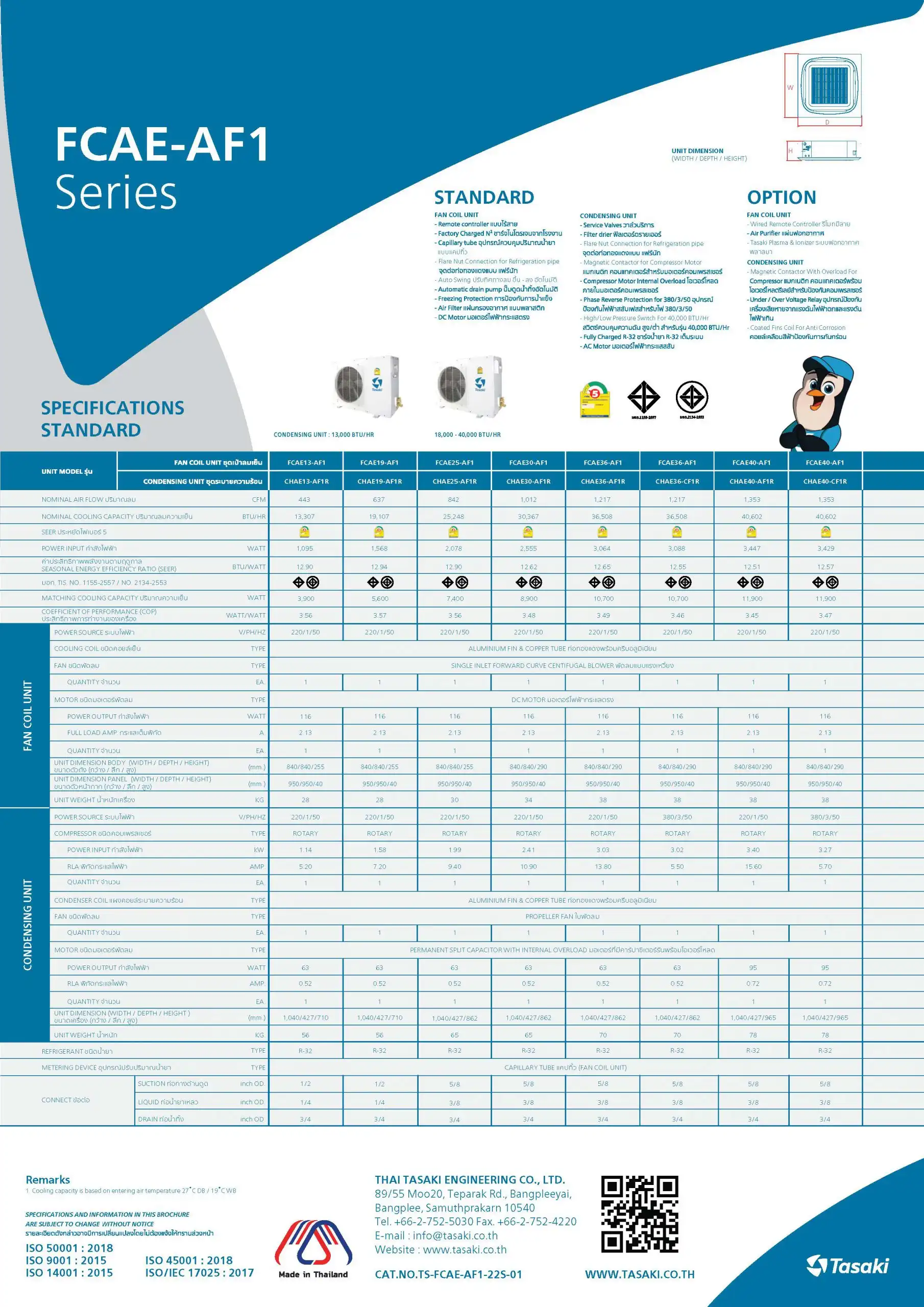 เครื่องปรับอากาศ TASAKI FIDE-AF2 SERIES เครื่องปรับอากาศแบบต่อท่อลม FIXED SPEED ด้วยค่าประหยัดไฟเบอร์ 5 ใช้สารทำความเย็น R32 มอเตอร์ DC ให้เสียงเงียบกว่า แผงคอยล์เคลือบสารสีฟ้า