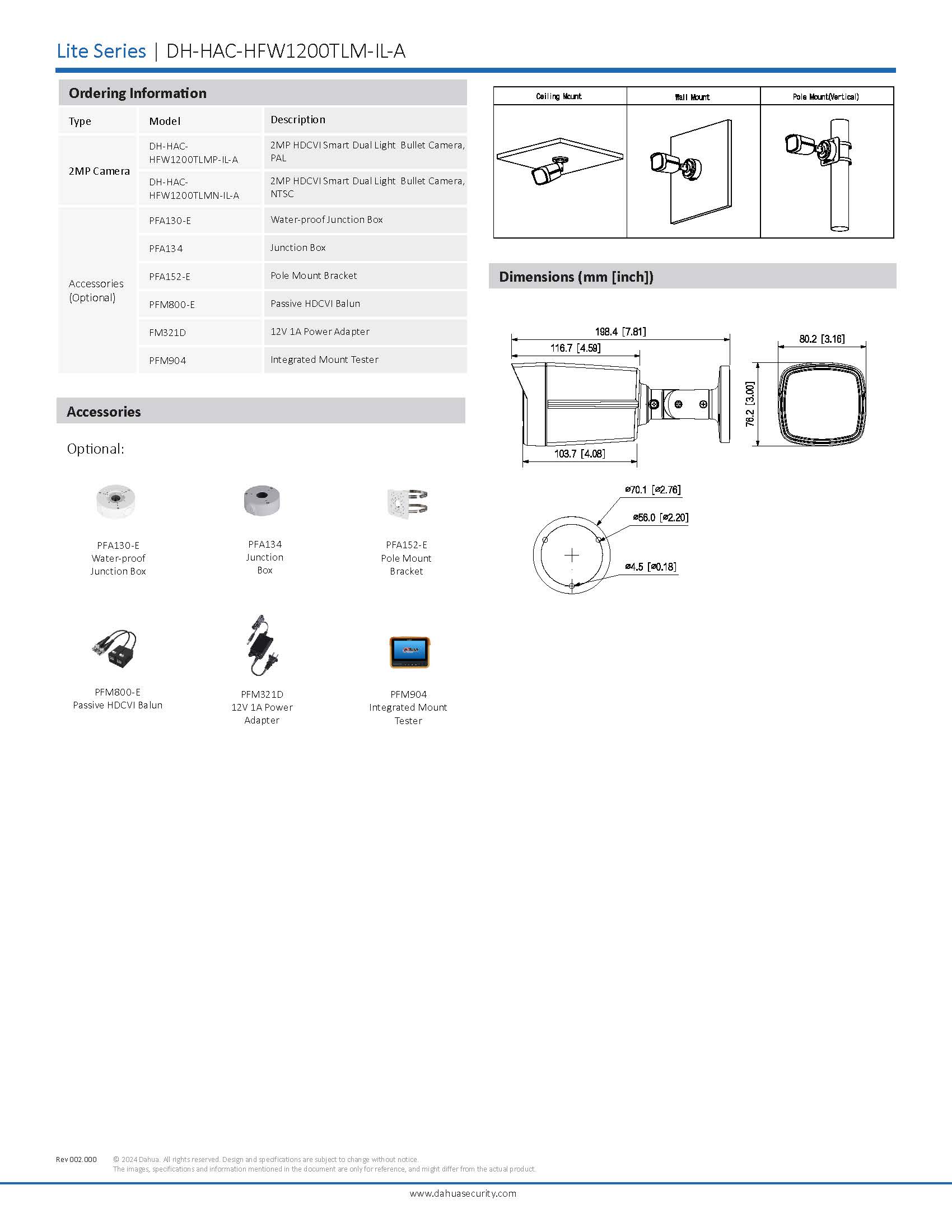 กล้องวงจรปิดรูปทรงกระบอก ระบบ IP ความละเอียด 2MP มีไมค์ในตัว มีระบบตรวจการเคลื่อนไหว รองรับมาตรฐานกันน้ำ IP67 รองรับ IR infrared LED และ LED แสงขาว (white light) สลับใช้อัตโนมัติตามสภาพแสงมีระยะการมองเห็นสูงสุด 40 เมตร ทั้ง IR และ white light
