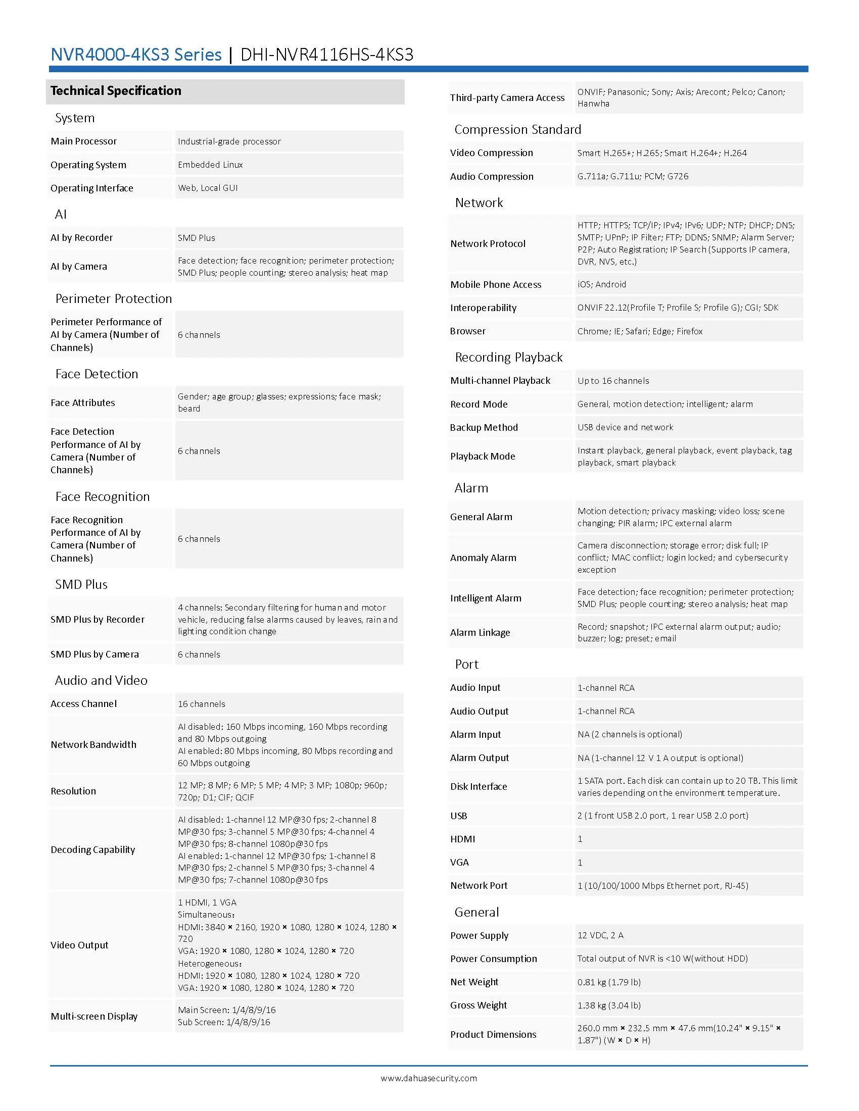 เครื่องบันทึกระบบ IP ขนาด 16 CH ความละเอียด 1080P รองรับการบีบอัดไฟล์แบบ H.265+, H.265, Smart H.264+, H.264 มีระบบตรวจจับการเคลื่อนไหว อีกทั้งยังสามารถตรวจจับใบหน้าได้ และนับจำนวนคนได้ ใส่ HDD ได้ 1 ลูก รองรับความจุสูงสุด 20TB