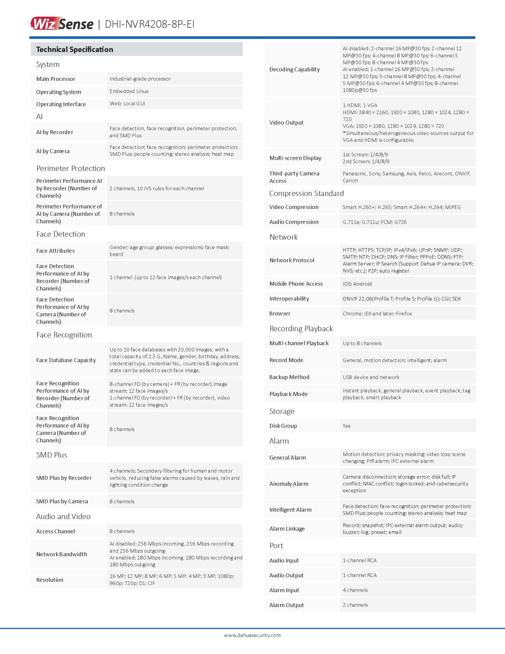 ครื่องบันทึกระบบ IP ขนาด 8 CH รองรับการบีบอัดไฟล์แบบ H.265+/H.265/Smart H.264+/H.264 ระบบตรวจจับการเคลื่อนไหว อีกทั้งยังสามารถตรวจจับใบหน้าได้ และนับจำนวนคนได้ ใส่ HDD ได้ 2 ลูก รองรับความจุสูงสุด 16TB