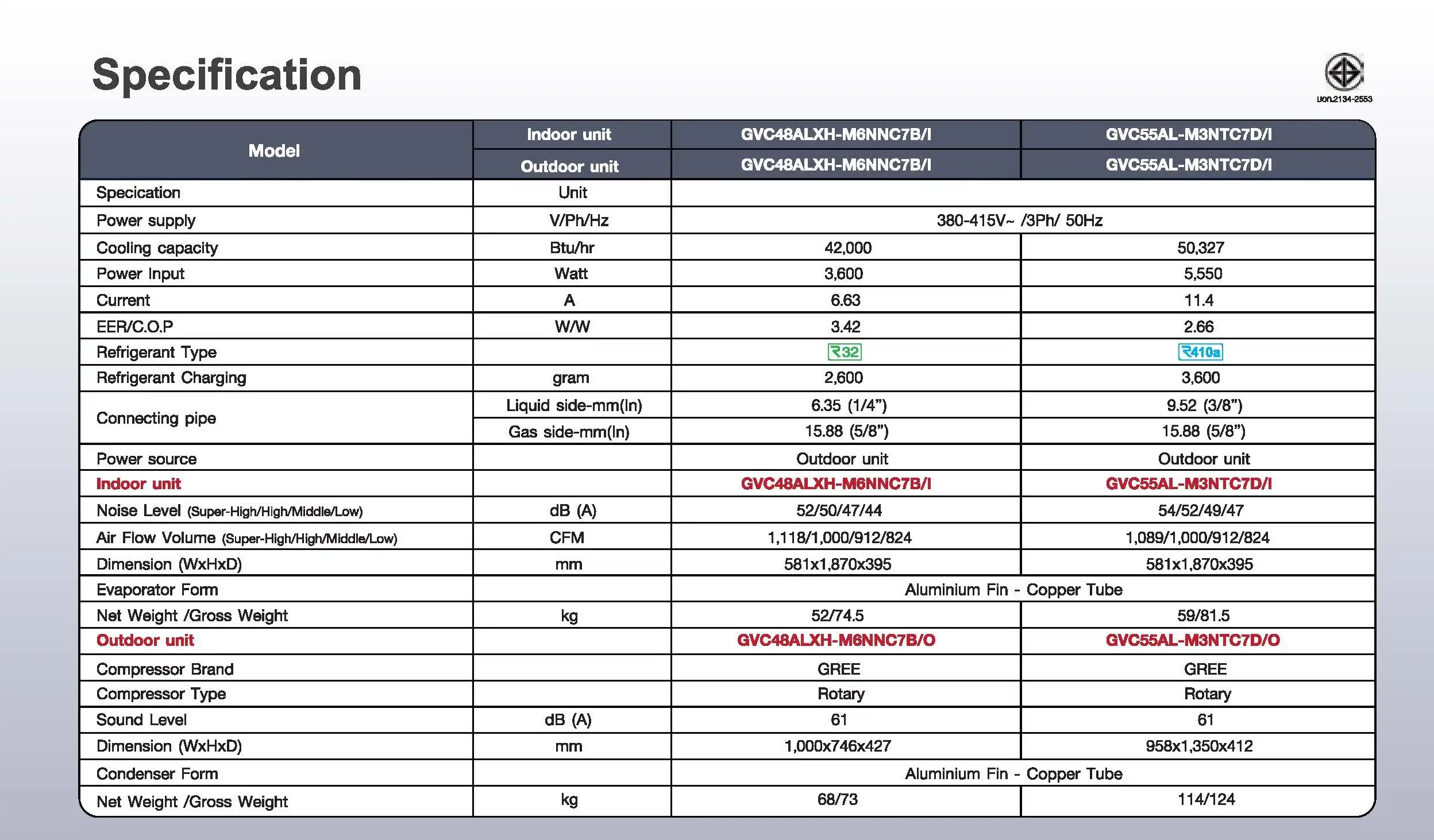 GVC55AL-M3NTC7D-I / GVC55AL-M3NTC7D-O (R410a)